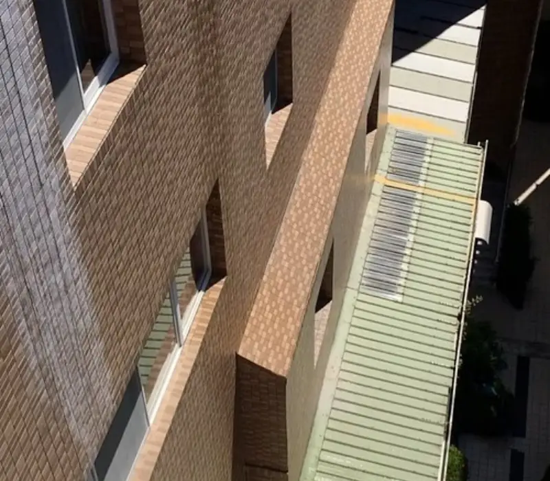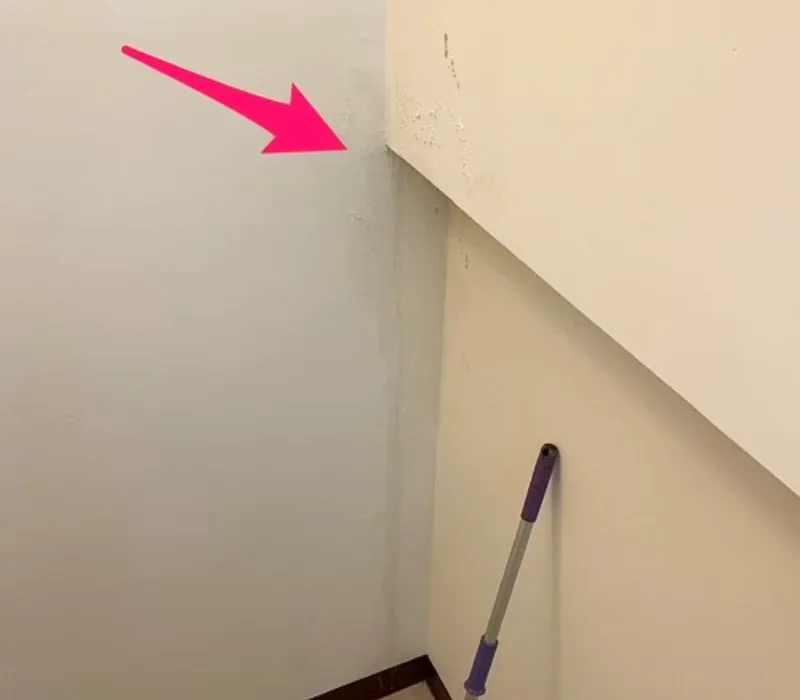 經現場檢查後發現,主要問題來自外牆磁磚未施作透明防水塗層,加上牆面設計突出斜面,成為積水區域,導致雨水沿牆體滲入室內。