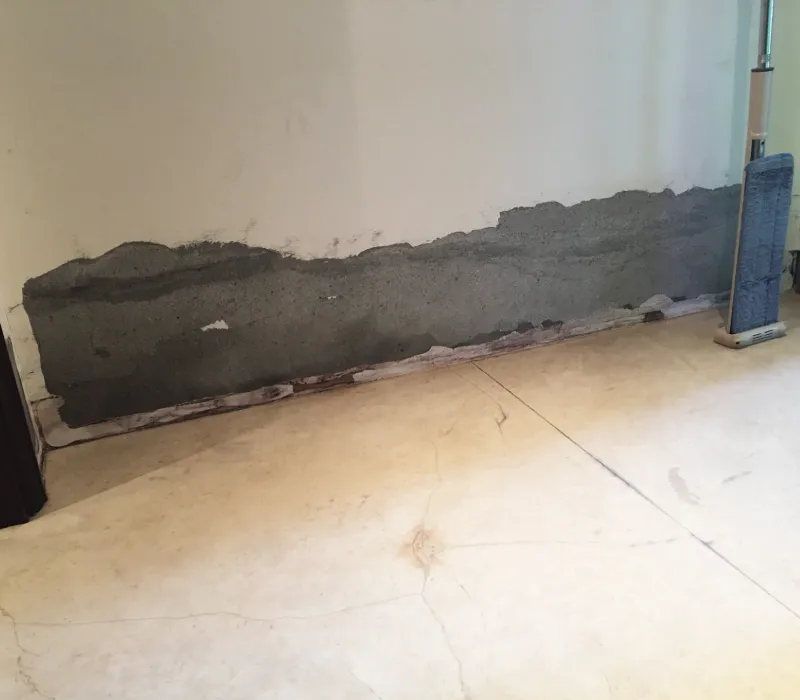 吾友宅修先執行水管灌藥止漏,接續採非破壞性的矽酸質滲透工法,全面浸泡門邊地坪結構,補強內部毛細孔滲水問題;然後再針對明顯滲水點則施作高壓灌注強化止水,最終搭配地坪剷除與重新鋪設,使水氣不再滯留。