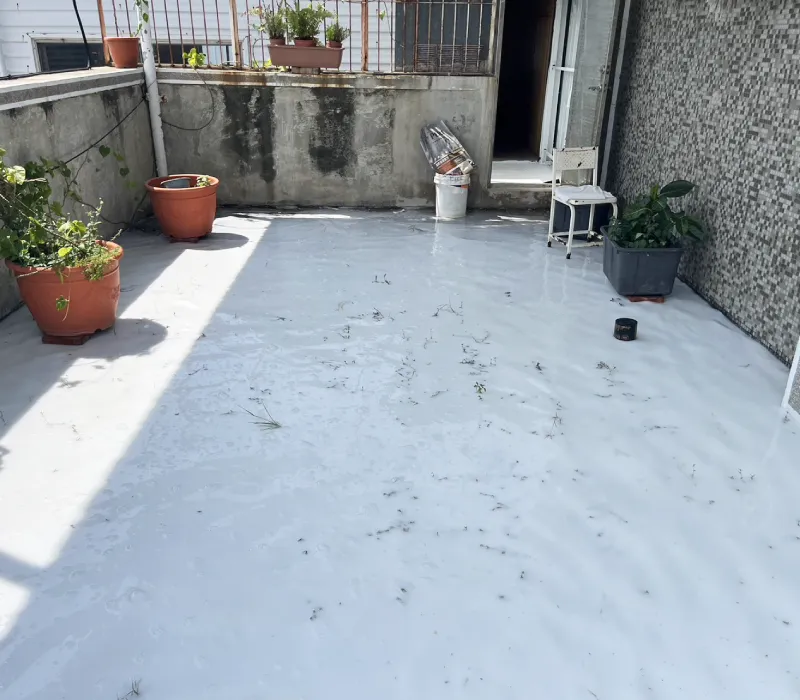 考量現場為隔熱磚地坪,且在整體規劃上亦需兼顧施作條件與預算配置。因此本案採用矽酸質材料進行全面浸泡滲透補漏,使材料深入毛細孔與細微縫隙中,強化基底密實度與防水能力。