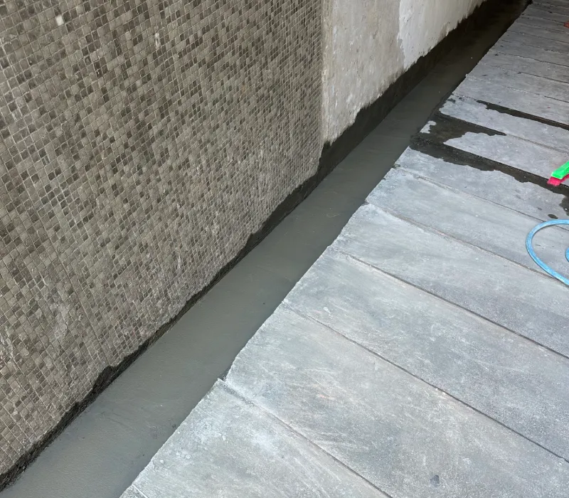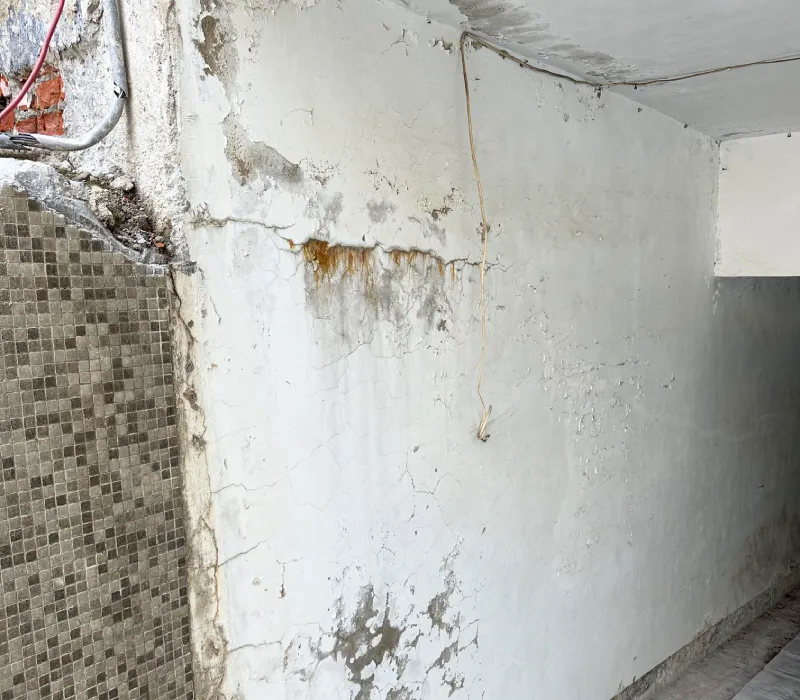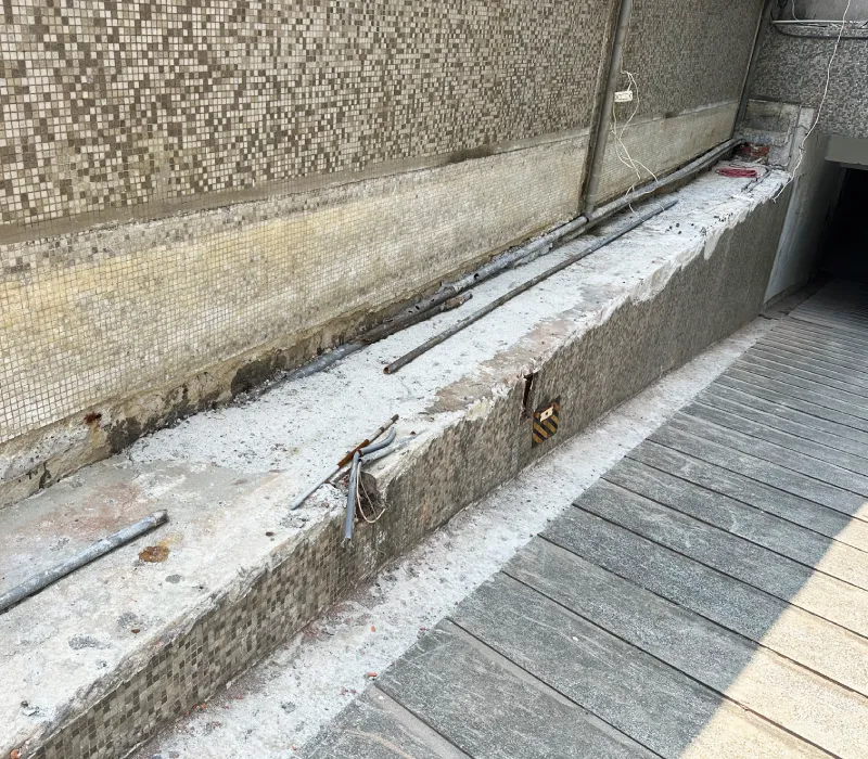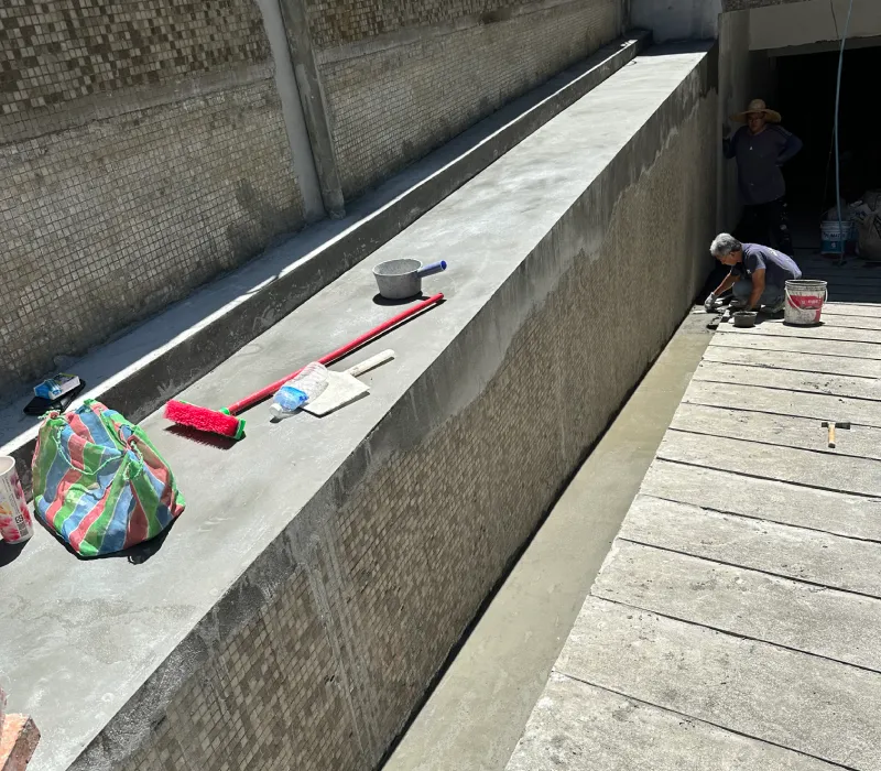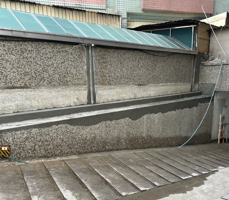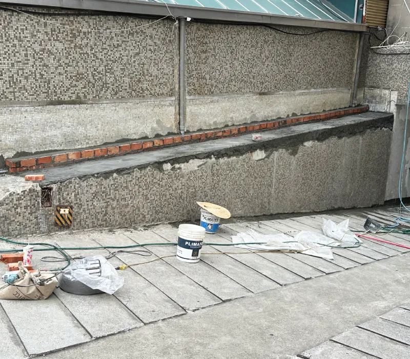 吾友宅修進場後,先針對滲漏區域進行牆面打除,全面清除劣化層,並清理環境、優化施工基面。施工過程中進行高壓止水灌注,後續施作砂漿管佈塗覆與牆面粗胚打底處理,最終優化防水層整體效果。