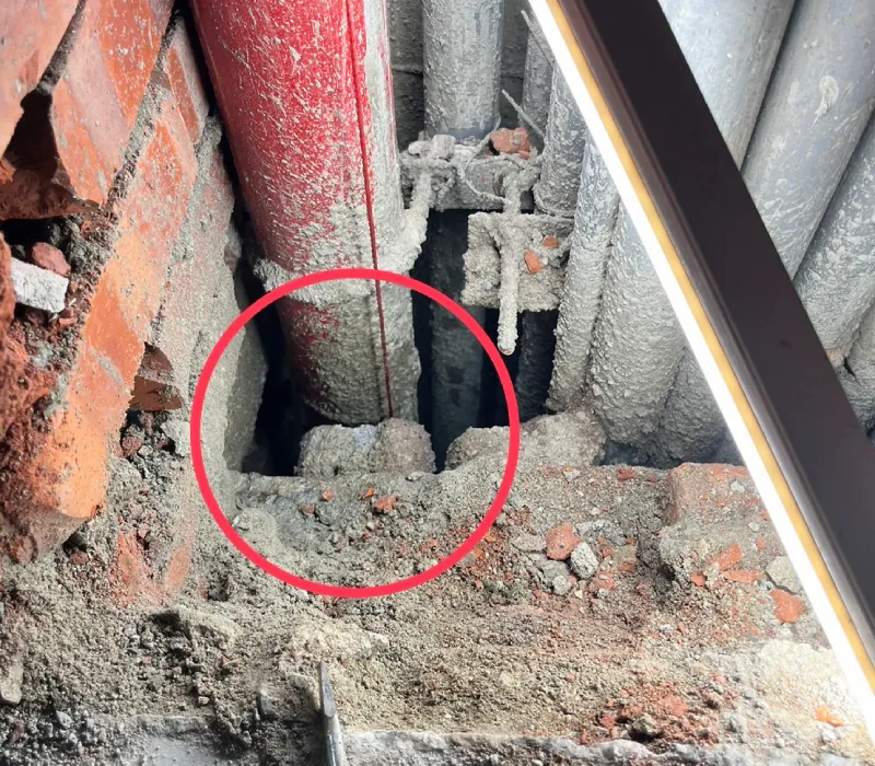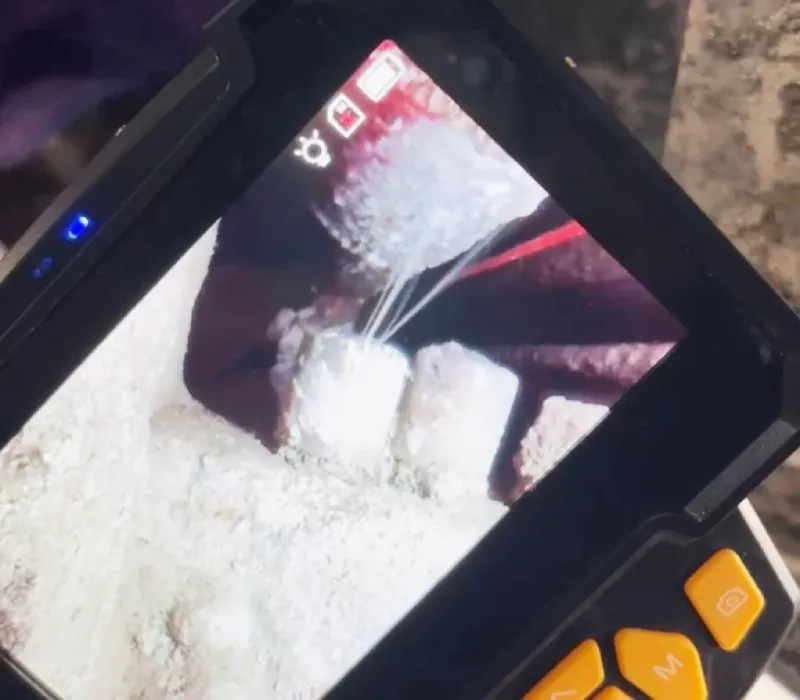 施工初期先施作管壓差止漏工法,作為第一階段止漏與觀察手段;在評估止水效果後,進一步於必要範圍內進行局部牆面打除,並搭配內視鏡檢測,針對管線內部狀況進行更深入檢查,透過多項測試與反應跡象交叉研判,最終找到明確的漏水位置。